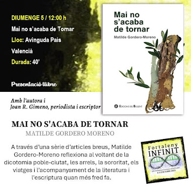 El 4 i 5 d¿octubre arriba a Fortaleny la primera edició de Fortaleny Infinit, un festival interdisciplinari que convertirà el poble en un escenari ple de cultura i creativitat. Hi haurà música, teatre, fotografia, poesia, literatura i art conviuran en un format itinerant on cada racó de Fortaleny es transformarà en part del relat. El poble i les seues històries seran el fil conductor d¿un cap de setmana únic. Tallers infantils, sessions de DJ, performance, presentacions de llibres i obres, microteatre, contes, exposicions de fotografia i propostes d¿art actiu¿ molt més que un festival, una manera de viure la cultura des de dins, amb el poble com a escenari i protagonista. Destaquem la presentació del llibre de Matilde Gordero-Moreno "Mai no s'acaba de tornar" el diumenge 5 d'octubre. Serà a les 12h en l'Av. País Valencià i acompanyarà l'autora el periodista i escriptor Joan R. Gimeno.[...]