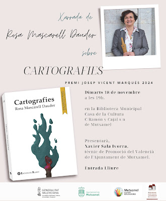 Rosa Mascarell Dauder, a Cartografies, reflexiona sobre el procés que ella ha seguit per a assolir l'equilibri interior, després d'unes vivències terriblement negatives I el seu pas per cases (i biblioteques) d'amistats que la van acollir. Els llibres i la filosofia la van ajudar a refer el camí que se li havia aturat. El treball li va valdre el premi d'Assaig Josep Vicent Marqués dels Premis Ciutat de València.Ara, amb múltiples xarrades i presentacions del llibre ens explica en persona l'essència del llibre que ha escrit. De Nord a Sud han pogut gaudir de les seues paraules des de Barcelona a Alacant, passant per molt altres llocs (Torrent, València, L'Alcúdia¿). La propera ocasió serà a Mutxamel.De matí es trobarà amb els alumnes de batxillerat del poble. I, de vesprada, la xerrada serà oberta a totes les persones i d'entrada lliure.Serà el dimarts 18 de novembre [...]