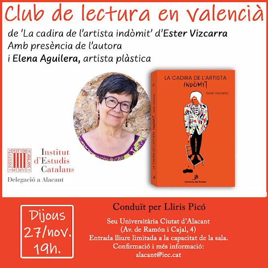 Els Clubs de Lectura de la Lliris Picó sempre destaquen el bo i milor de la literatura valenciana. El proper dijous 27 de novembre a les 19h, en la Seu Universitària Ciutat d'Alacant (Av. Ramon i Cajal, 4), tindrà lloc l'encontre al voltant del llibre La cadira de l'artista indòmit, d'Ester Vizcarra. Conduïrà la xarrada Lliris Picó i comptarem amb la presència de l'autora.La novel·la narra el periple vital de Manuel Solbes Arjona, singular artista alcoià fascinat per l'expressionisme abstracte. Sent que ha de deixar la seva ciutat, l¿Alcoi dels anys 60, per desenvolupar-se artísticament: es trasllada a Madrid, Barcelona, València i Las Palmas de Gran Canaria. L¿artista s'endinsa allà en el conceptualisme abstracte, assaja el neodadà i també s¿aventura en la literatura experimental i la performance. Pinta a Venècia i viu la Nova York de l¿èlit artística del moment,[...]