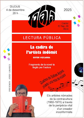 A Alcoi, Tocata (c/ el tap, 29) sembla el lloc adient per celebrar els artistes nòmandes de la contracultura (1960-1970) a través de la peripècia vital de Manuel Solbes Arjona, un creador inconformista. Amb lectura del llibre 'La cadira de l'artista indòmit', d'Ester Vizcarra. Amb lectura per part de l'autora mateixa, a qui presentarà Joan Linares i també picadeta, amanida de fragments musicals dels anys 60 i 70, com escau a la novel·la, serà:?? Dijous 4 de desembre? a les 20h?? Tocata (c/ el tap, 29, d'ALCOI)?? L'autora, Ester Vizcarra i Joan Linares.A 'La cadira de l'artista indòmit'¿ Manuel, un jove enamorat de l¿expressionisme abstracte, sent que ha de deixar la seva ciutat, l¿Alcoi dels anys 60, per desenvolupar-se artísticament. Amb aquest objectiu es trasllada a Madrid, Barcelona, València i Las Palmas de Gran Canaria, on s'uneix a grups influenciats pel surrealisme i la contracultura.[...]