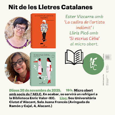 El 20 de novembre, se celebra el Dia del Llibre Valencià. Es commemora este dia perquè, en esta data de 1490, es va publicar en valencià la primera edició del Tirant lo Blanc, de Joanot Martorell.Enguany l'AELC d'Alacant ha organitzat la Nit de les Lletres Catalanes, coincidint amb l'efemèride. La celebració reunirà lletraferits i interessats en la literatura en un acte de Micro obert en el qual alguns socis de l'AELC llegiran un fragment de les seues obres:Destaquem la participació de l'escriptora Lliris Picó amb la novel·la 'Si escrius Cèlia¿' i Ester Vizcarra amb 'La cadira de l'artista indòmit'. 'Si escrius Cèlia¿' homenatja a les dones a través de dues protagonistes, una escriptora i altra que és personatge literari de la primera (o alguna cosa més). 'La cadira de l'artista indòmit' narra amb detall les passions, amistats i [...]