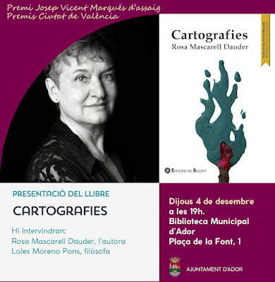 Després de la meravellosa acollida a Mutxamel, Cartografies, de Rosa Mascarell es presenta a La Safor. Concretament al poble de l'autora, Ador. Serà el dijous 4 de desembre a la Biblioteca Municipal a les 19h. Amb l'autora, Rosa Mascarell i la també filòsofa Loles Moreno Pons.En la seua darrera obra, Cartografies, Rosa Mascarell reflexiona sobre el procés que ella ha seguit per a assolir l'equilibri interior, després d'unes vivències terriblement negatives I el seu pas per cases (i biblioteques) d'amistats que la van acollir. Va guanyar el Premi Josep Vicent Marqués d'assaig, dins els premis Ciutat de València.Per saber més sobre Cartografies: https://www.bullent.net/libro/3335-cartografiesRosa Mascarell Dauder (Gandia, 1963) Escriptora, gestora cultural i artista. Llicenciada en Filosofia i Ciències de l'Educació (UV), Màster en Estè[...]