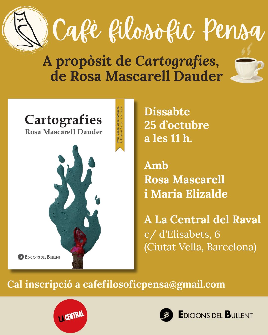 El dissabte 25 d¿octubre a les 11.00 h, la llibreria La Central del Raval ens convoca a un Cafè Filosòfic Pensa amb la filòsofa Rosa Mascarell. La presentació anirà a càrrec de Maria Elizalde a propòsit de 'Cartografies' llibre guanyador del Premi Josep Vicent Marqués d'Assaig. Cal confirmar assistència al correu Inscripció prèvia a través del correu cafefilosoficpensa@gmail.com donat que disposen d¿un aforament limitat a 50 persones. TÍTOL: UN EXERCICI DE FILOSOFIA IMPURA RESUM: Cartografies, és un assaig filosòfic que utilitza el pensament de filòsofs de referència ¿aquells que conformen el corpus dels clàssics¿, per a bastir una reflexió l¿objectiu de la qual és aprendre a viure amb plenitud. Rosa Mascarell ha viscut un periple vital intens, vivències molt negatives i altres enormement [...]